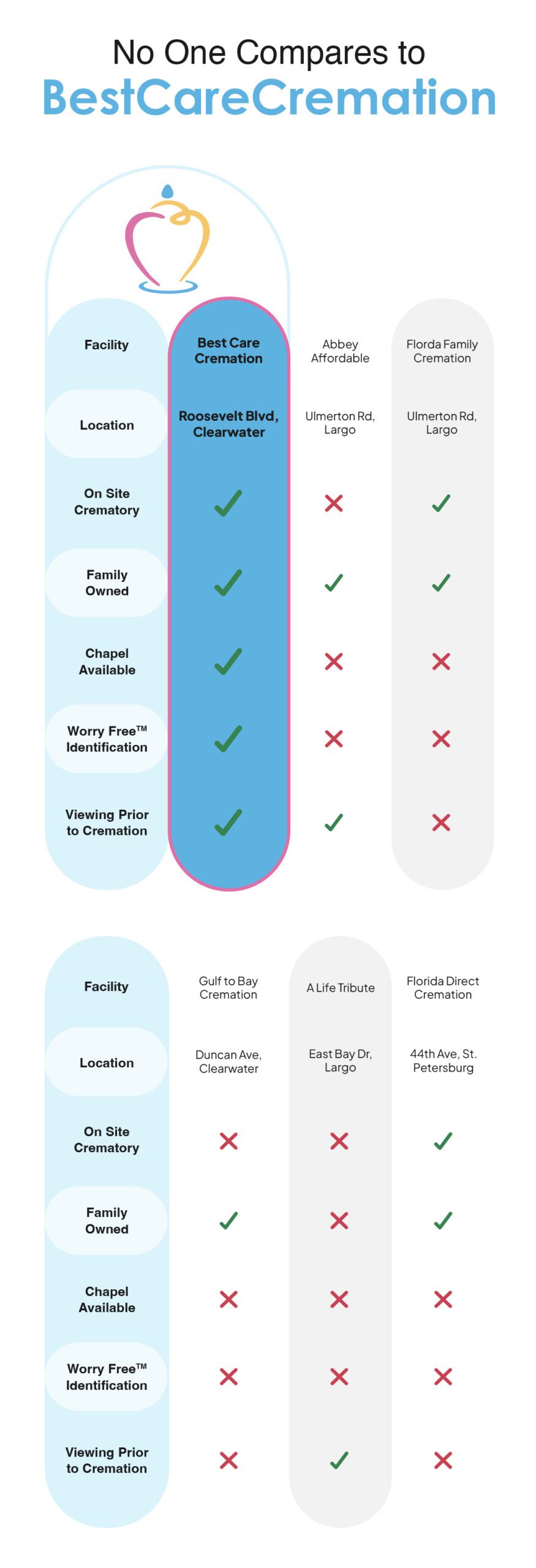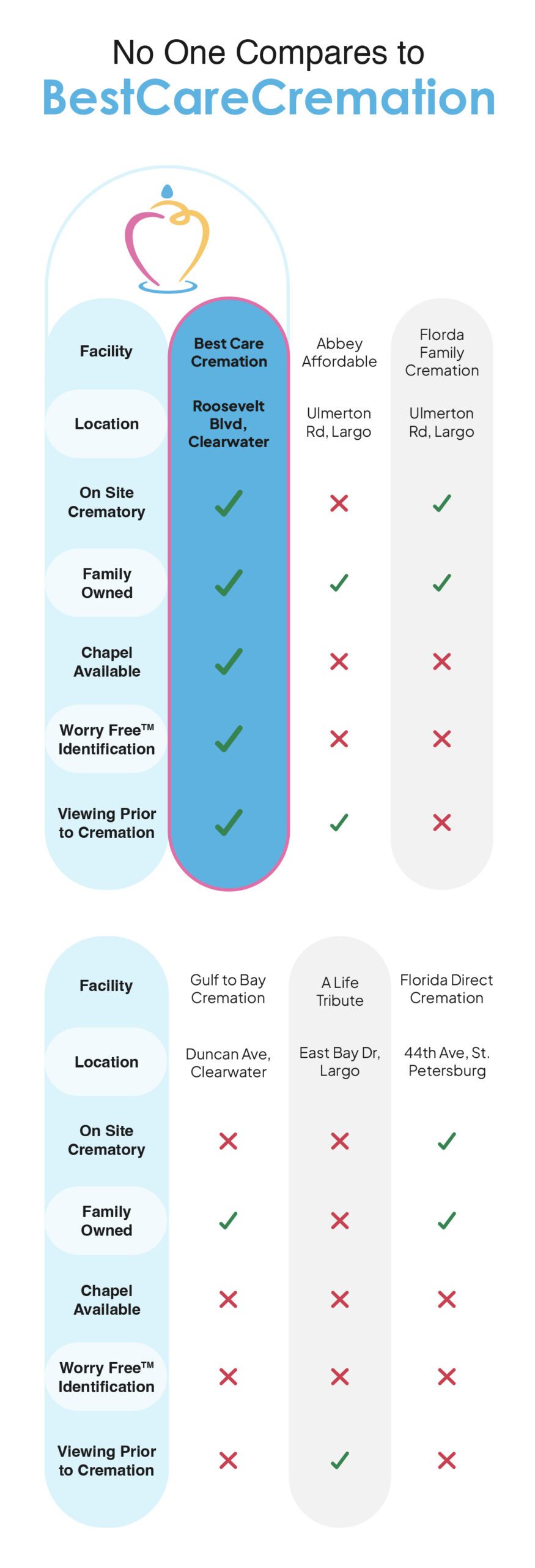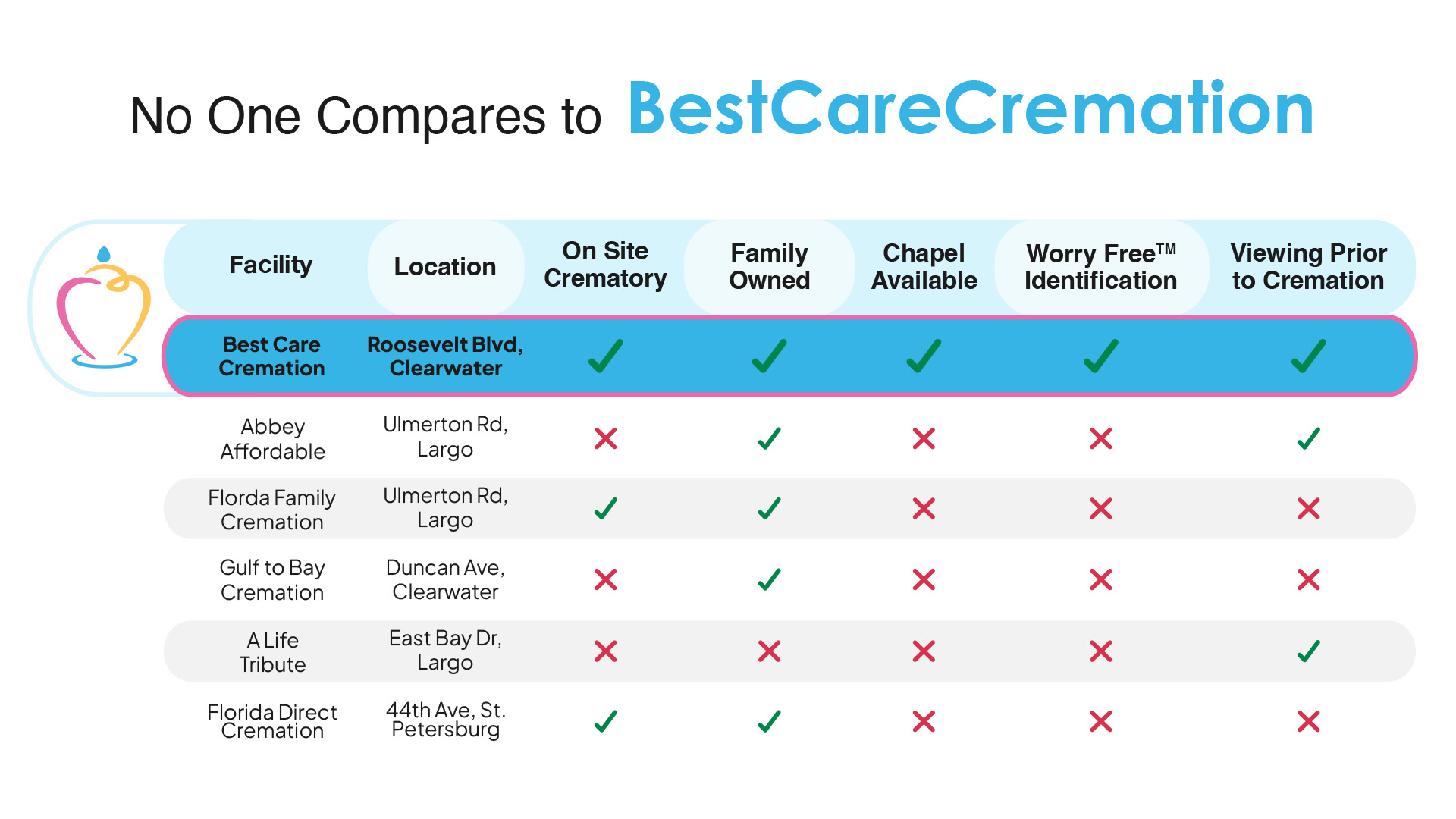 Best Care Cremation provides thorough cremation services in Florida. We deeply understand the grief of losing a loved one and under these difficult circumstances, it has become our mission to provide a no-hassle and worry-free experience for the bereaved. For many years, we have helped families in Florida honor their loved one's memory and serve for their final care. It is our goal to provide you with options that represent your family’s unique identity. We offer dignified cremation services in Clearwater, Largo, and St. Petersburg, FL. Contact us!